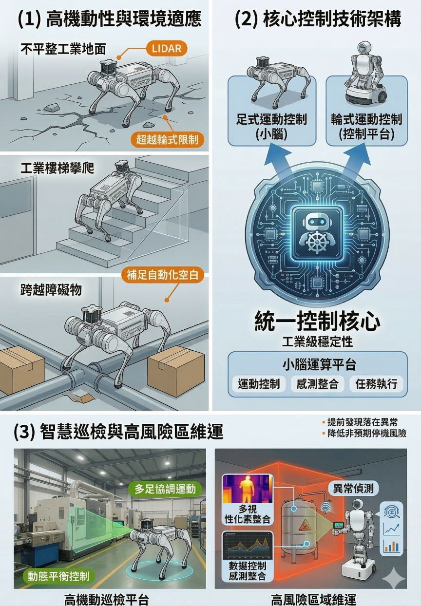 盟立機器狗(足式機器人)以高機動性與複雜環境適應能力為核心,聚焦於傳統輪式設備難以覆蓋之工業場域,作為智慧工廠與大型設施中之高階移動作業與巡檢平台。其應用場景包含不平整地面、樓梯、高低落差空間及需跨越障礙之環境,補足既有自動化系統在複雜空間中的部署限制。